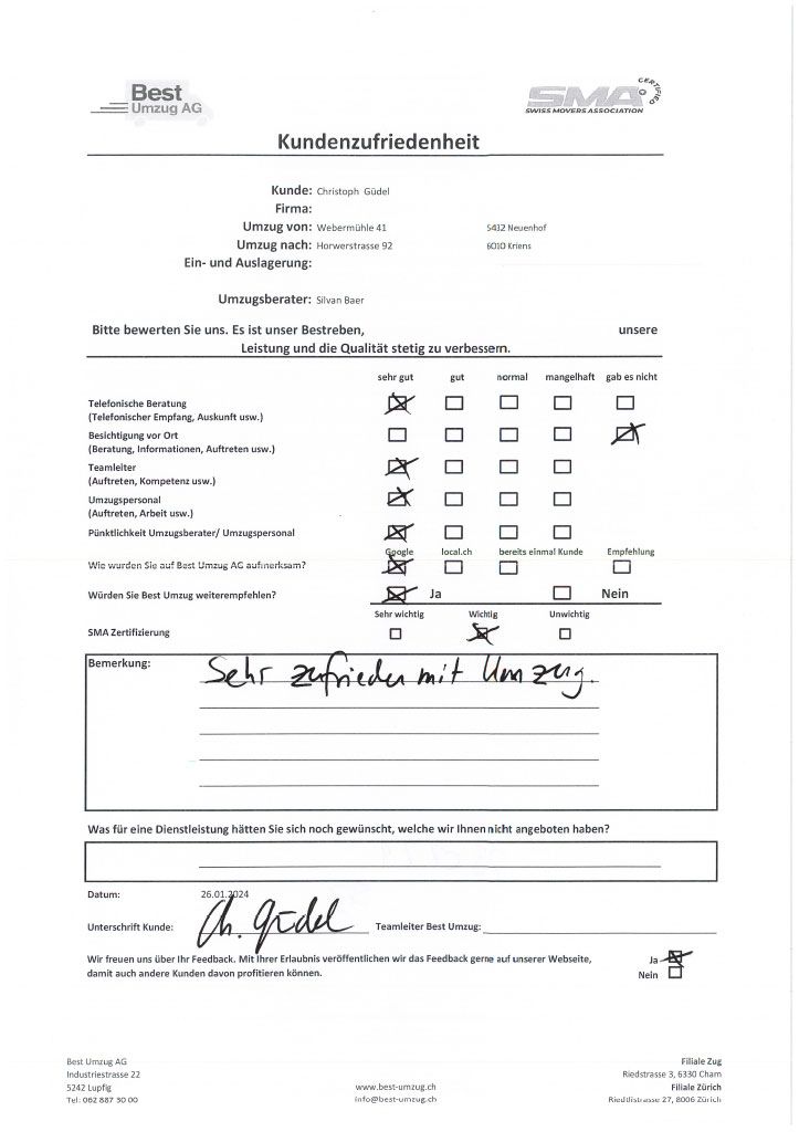 Die Zufriedenheit des Kunden mit unserem Umzugsservice steht stets an erster Stelle. Aus diesem Grund können Sie sich hier selbst ein Bild von der Bewertung des Umzugs seitens unserer Kunden machen. Um unsere Umzugsfirma kontinuierlich zu verbessern und auf Anregungen reagieren zu können, führen wir regelmässige Befragungen zur Kundenzufriedenheit durch. Nicht nur die Arbeit des Umzugspersonals, sondern auch die telefonische Beratung, die Besichtigung vor Ort, das Auftreten des Teamleiters und die Pünktlichkeit sind wir für uns wichtig.