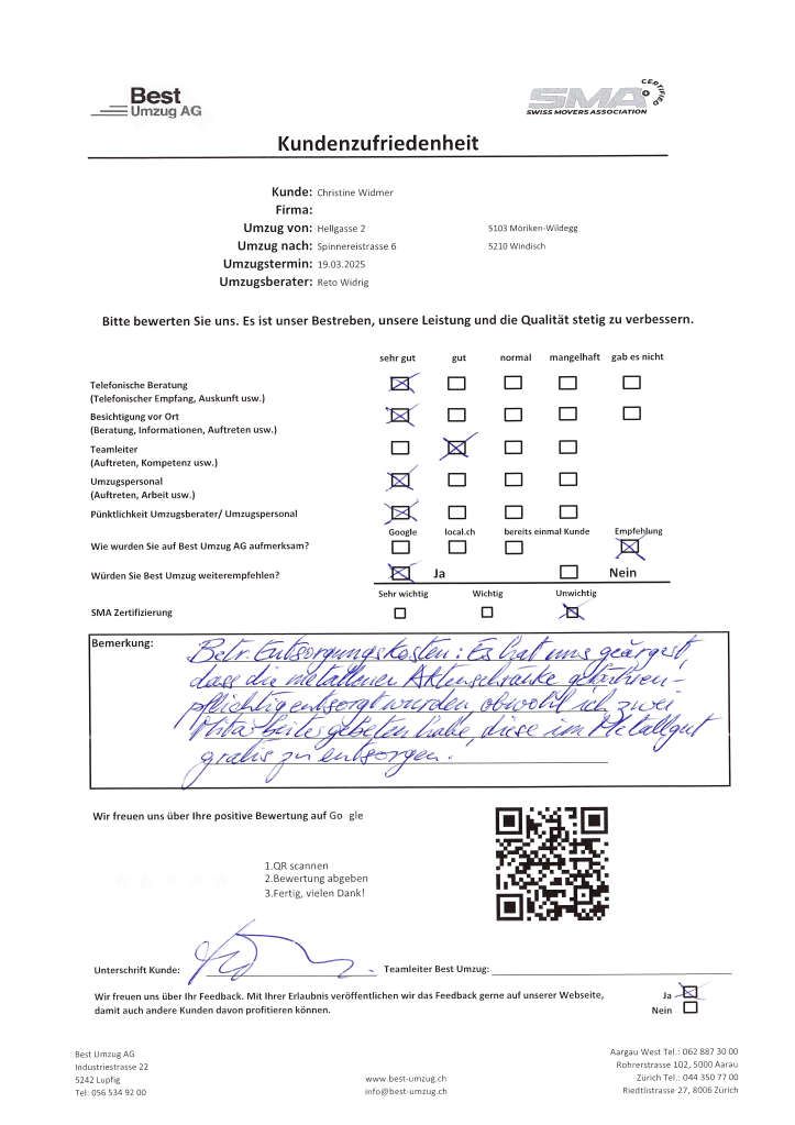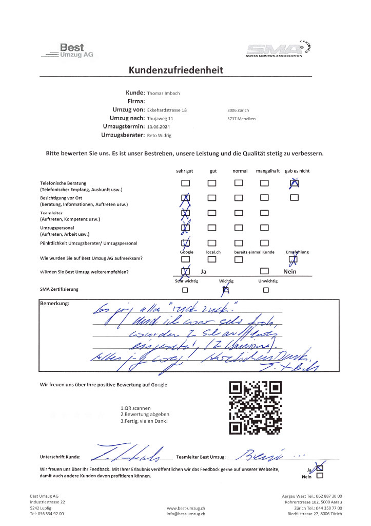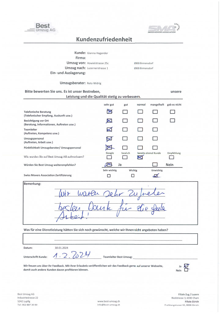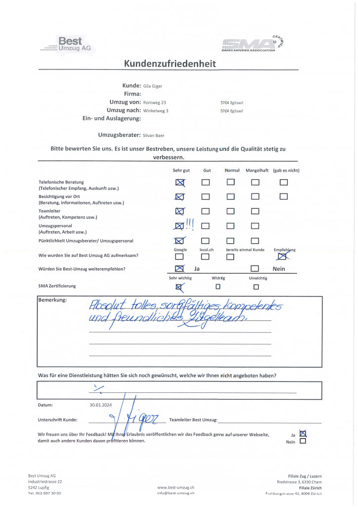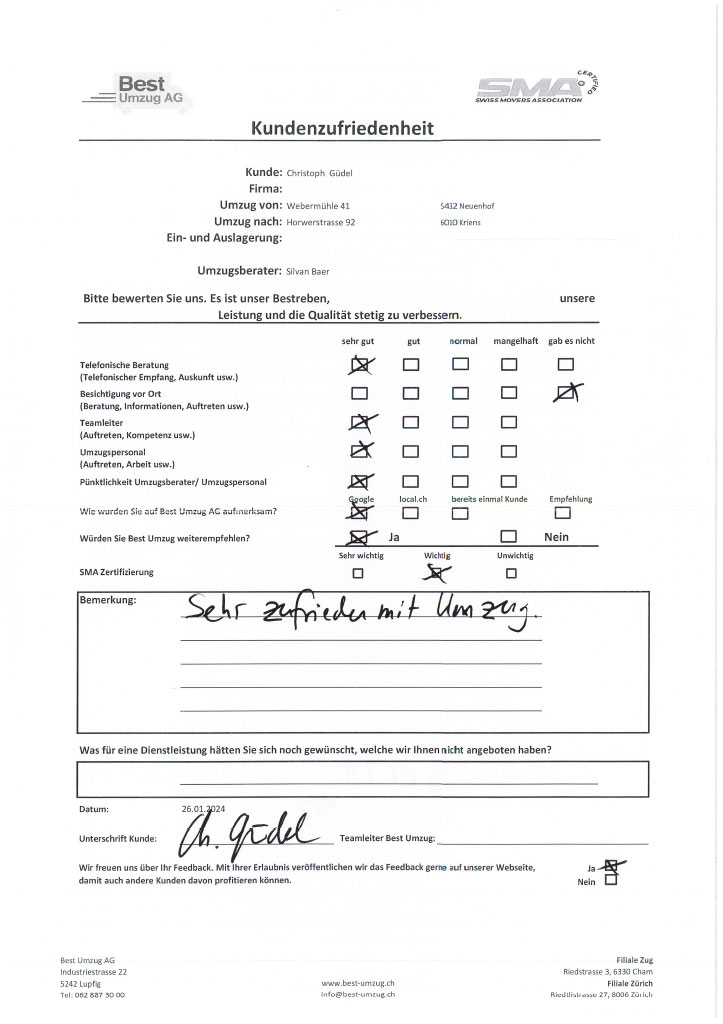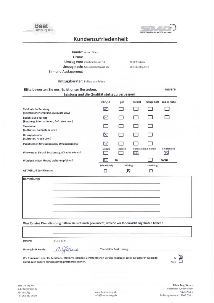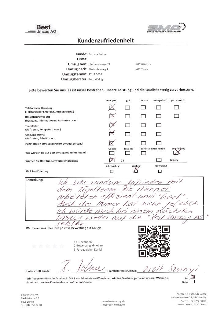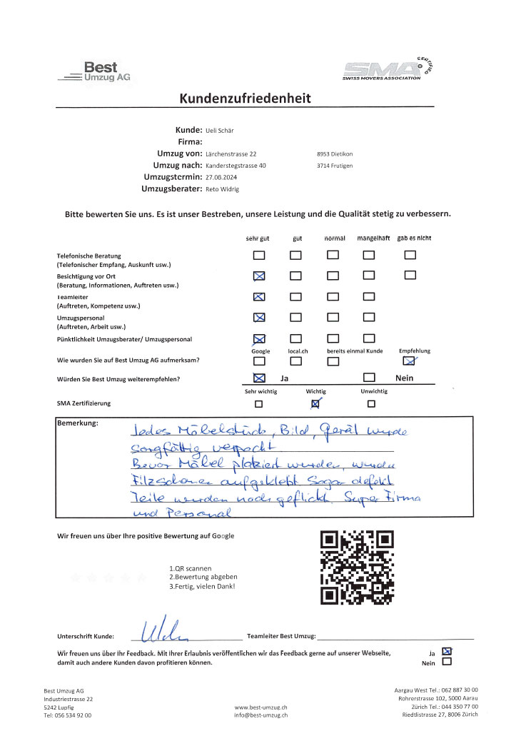 Die Zufriedenheit des Kunden mit unserem Umzugsservice steht stets an erster Stelle. Aus diesem Grund können Sie sich hier selbst ein Bild von der Bewertung des Umzugs seitens unserer Kunden machen. Um unsere Umzugsfirma kontinuierlich zu verbessern und auf Anregungen reagieren zu können, führen wir regelmässige Befragungen zur Kundenzufriedenheit durch. Nicht nur die Arbeit des Umzugspersonals, sondern auch die telefonische Beratung, die Besichtigung vor Ort, das Auftreten des Teamleiters und die Pünktlichkeit sind wir für uns wichtig.