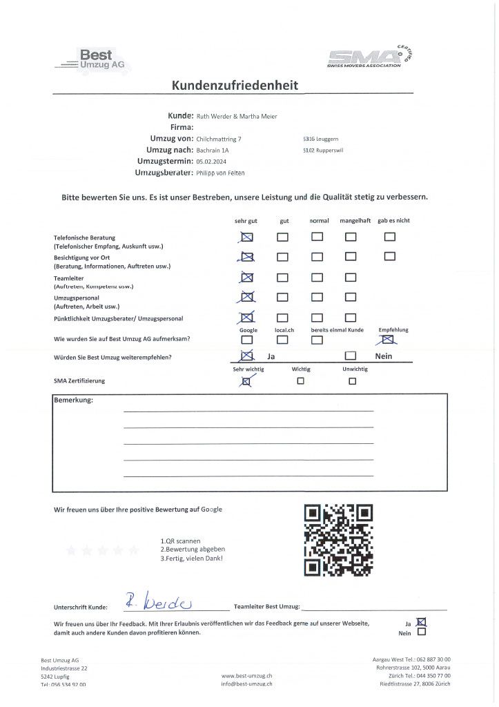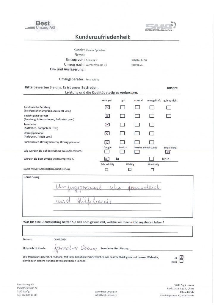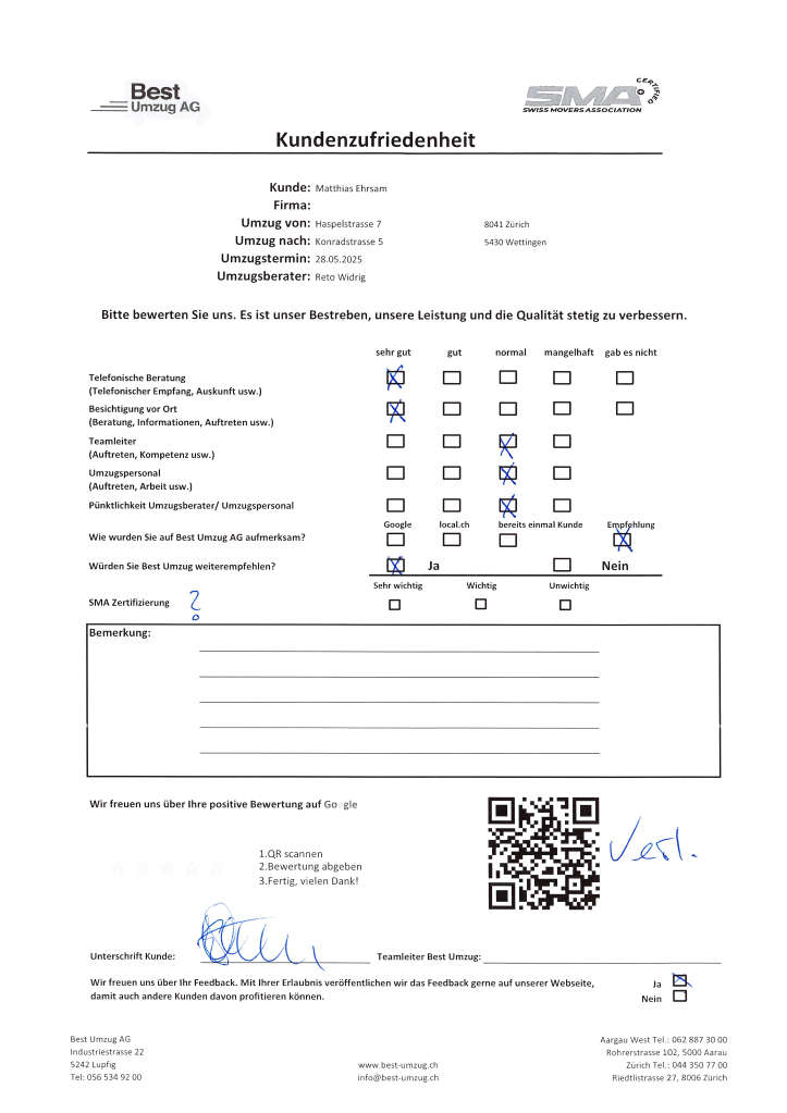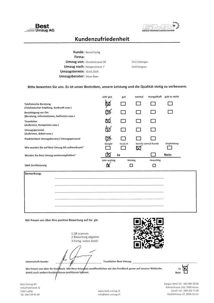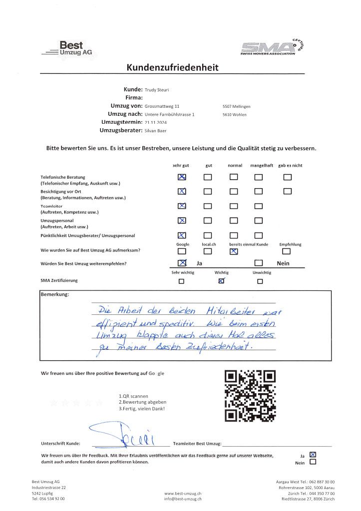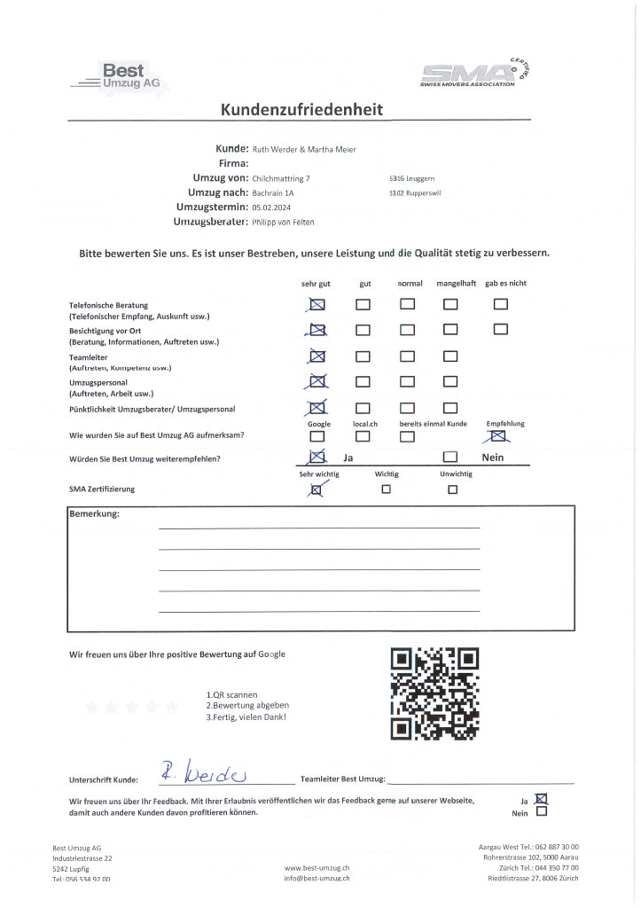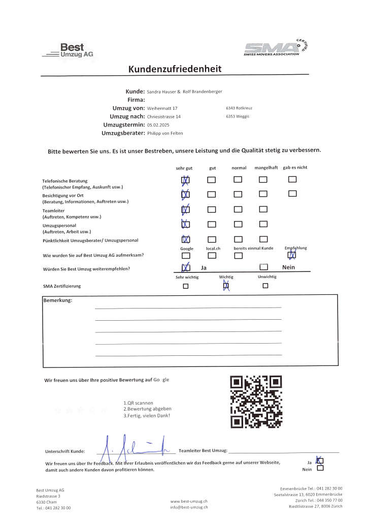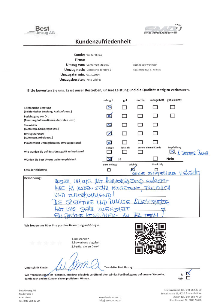Die Zufriedenheit des Kunden mit unserem Umzugsservice steht stets an erster Stelle. Aus diesem Grund können Sie sich hier selbst ein Bild von der Bewertung des Umzugs seitens unserer Kunden machen. Um unsere Umzugsfirma kontinuierlich zu verbessern und auf Anregungen reagieren zu können, führen wir regelmässige Befragungen zur Kundenzufriedenheit durch. Nicht nur die Arbeit des Umzugspersonals, sondern auch die telefonische Beratung, die Besichtigung vor Ort, das Auftreten des Teamleiters und die Pünktlichkeit sind wir für uns wichtig.