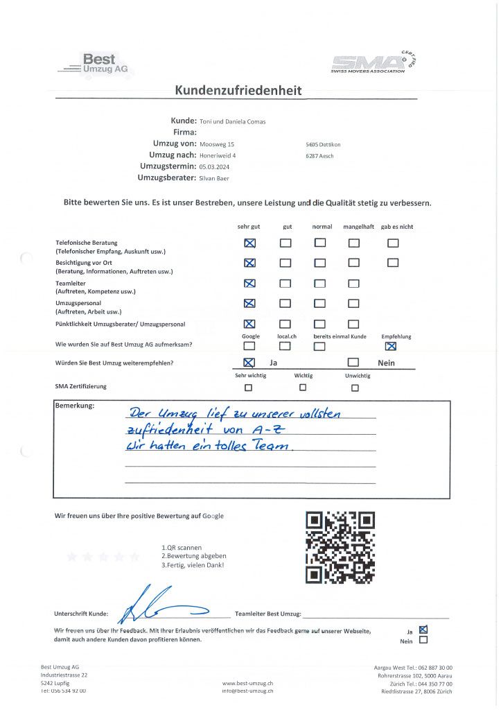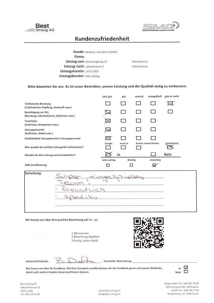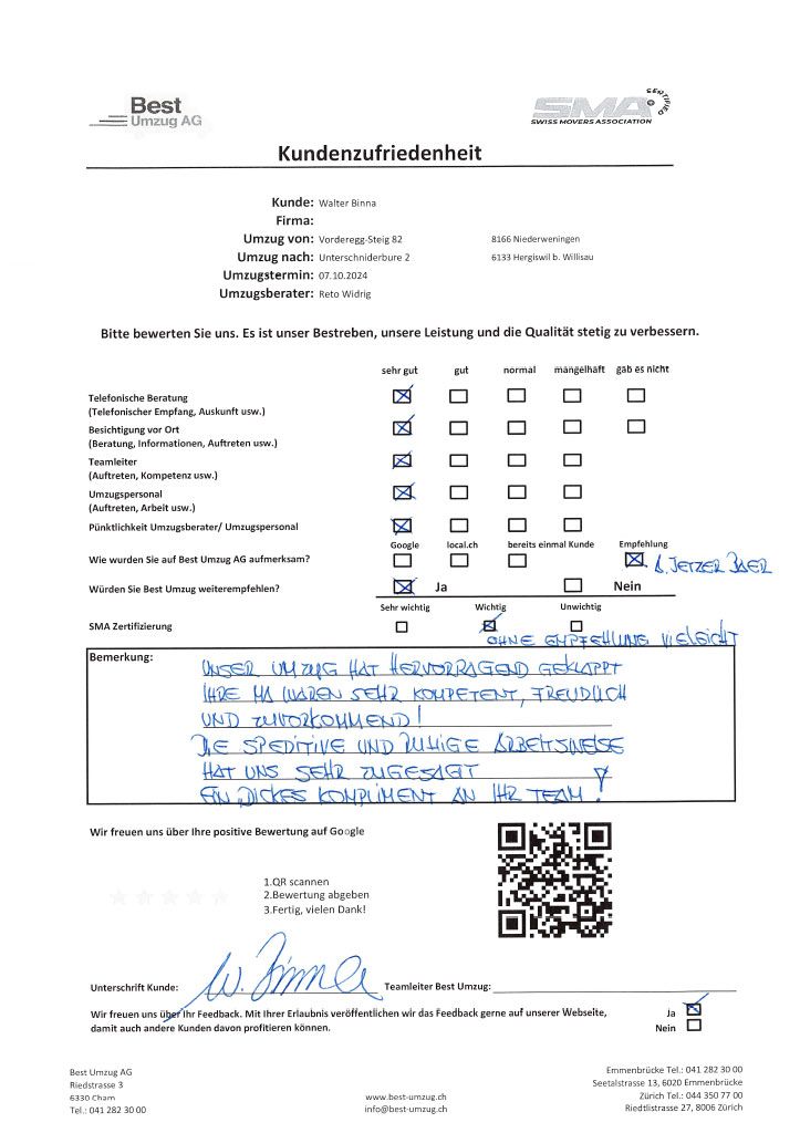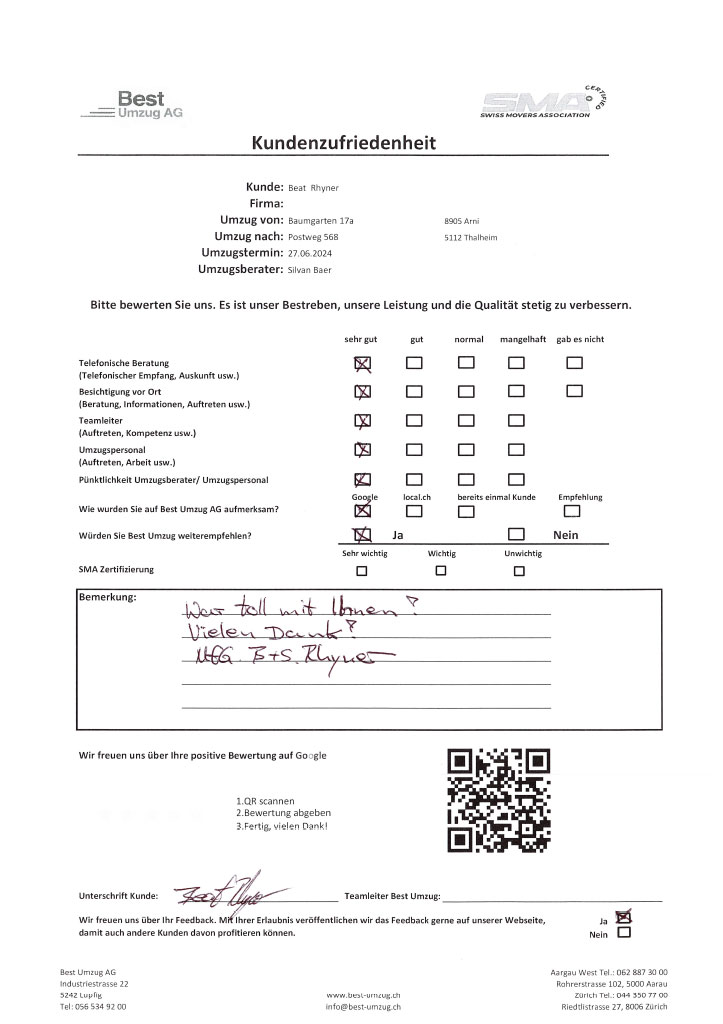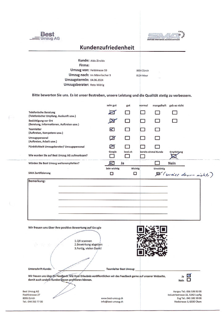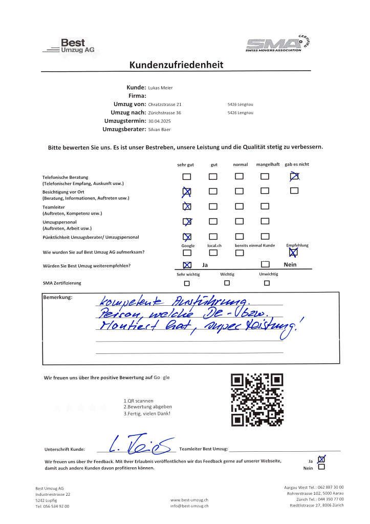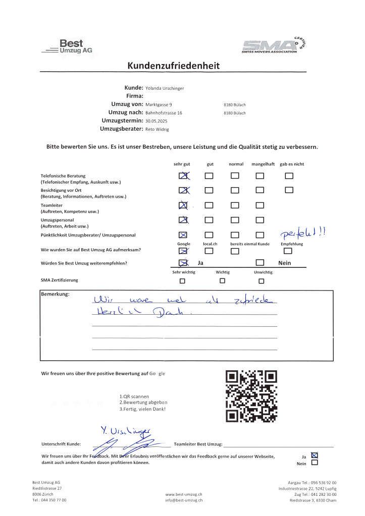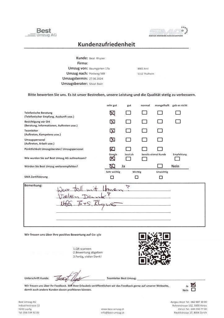 Die Zufriedenheit des Kunden mit unserem Umzugsservice steht stets an erster Stelle. Aus diesem Grund können Sie sich hier selbst ein Bild von der Bewertung des Umzugs seitens unserer Kunden machen. Um unsere Umzugsfirma kontinuierlich zu verbessern und auf Anregungen reagieren zu können, führen wir regelmässige Befragungen zur Kundenzufriedenheit durch. Nicht nur die Arbeit des Umzugspersonals, sondern auch die telefonische Beratung, die Besichtigung vor Ort, das Auftreten des Teamleiters und die Pünktlichkeit sind wir für uns wichtig.